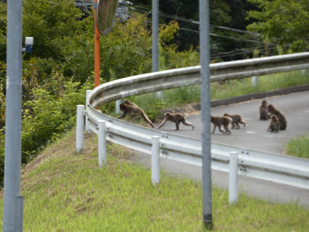 房総半島の山猿は、奥多摩の山猿よりも警戒心が強い感じです。二輪四輪の走行が途絶えたとみるや、それこそ、ドドドって感じで渡ります。立って見ていると、見えにくいところへ遠回りします。