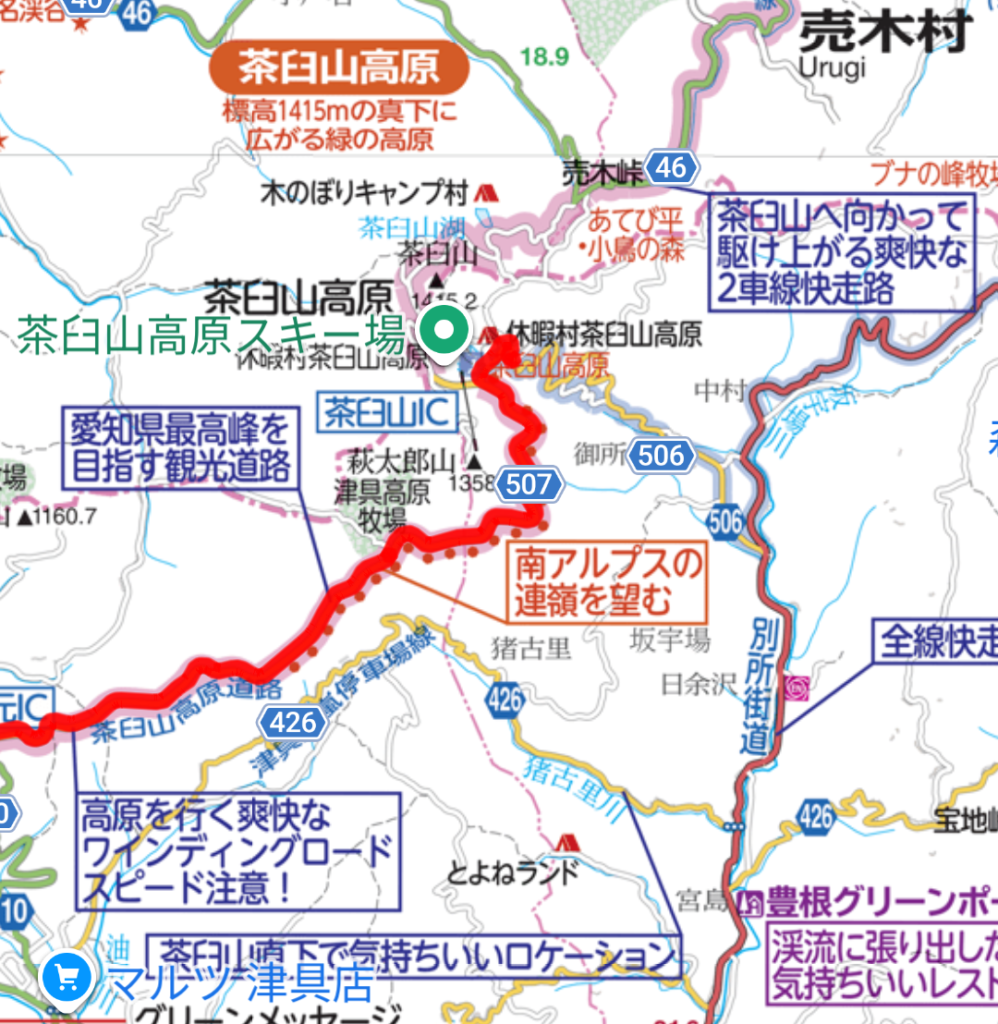 茶臼山高原スキー場まで登っていって。山頂手前の降雪部分で1回転倒し、その後、国道151号に降りていく近道で2回転倒した時点で、未知の下り坂へ進むのでなく、国道に出るまで遠回りになっても、来た道を引き返すことにしたわけです。